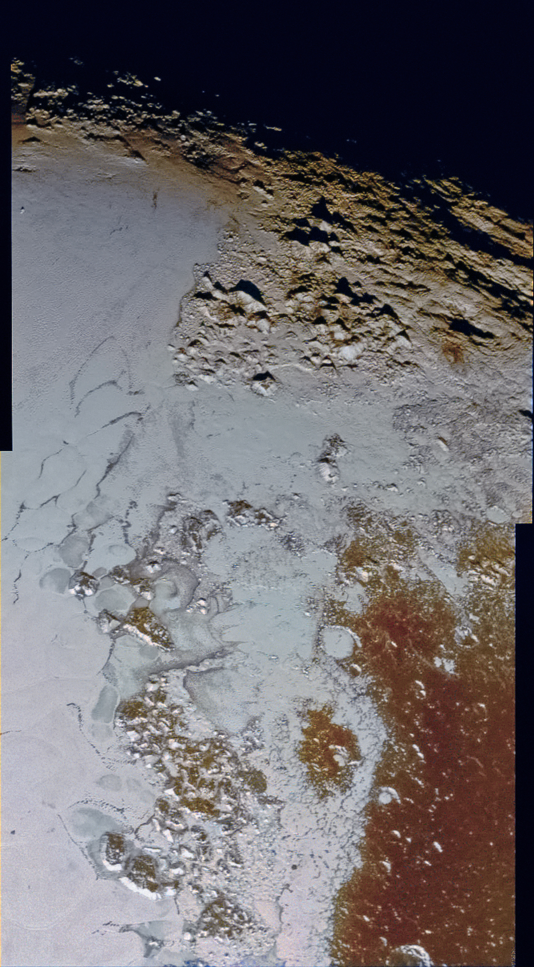 "C'è una differenza marcata nella struttura tra le giovani pianure ghiacciate ad est e il terreno scuro pesantemente craterizzato a ovest", ha detto Jeff Moore, geologo della missione presso l'Ames Research Center a Moffett Field, California. "C'è una complessa interazione, che stiamo ancora cercando di capire, tra i materiali scuri e chiari". Mentre Sputnik Planum sembra essere relativamente giovane in termini geologici, forse meno di 100 milioni di anni, la regione più scura risale probabilmente miliardi di anni, come suggerito dalla presenza o meno di crateri.